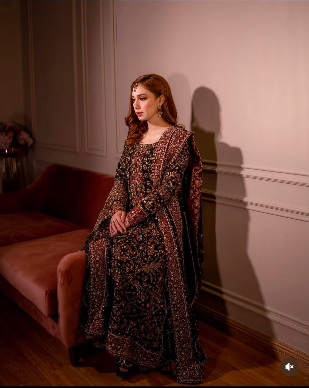 The Shayna ensemble is a stunning and unique bridal or formal outfit, reflecting Haris Shakeel’s signature style. This ensemble is crafted with intricate techniques like zardozi, gota, and zari work, showcasing a beautiful blend of traditional heritage and modern fashion.