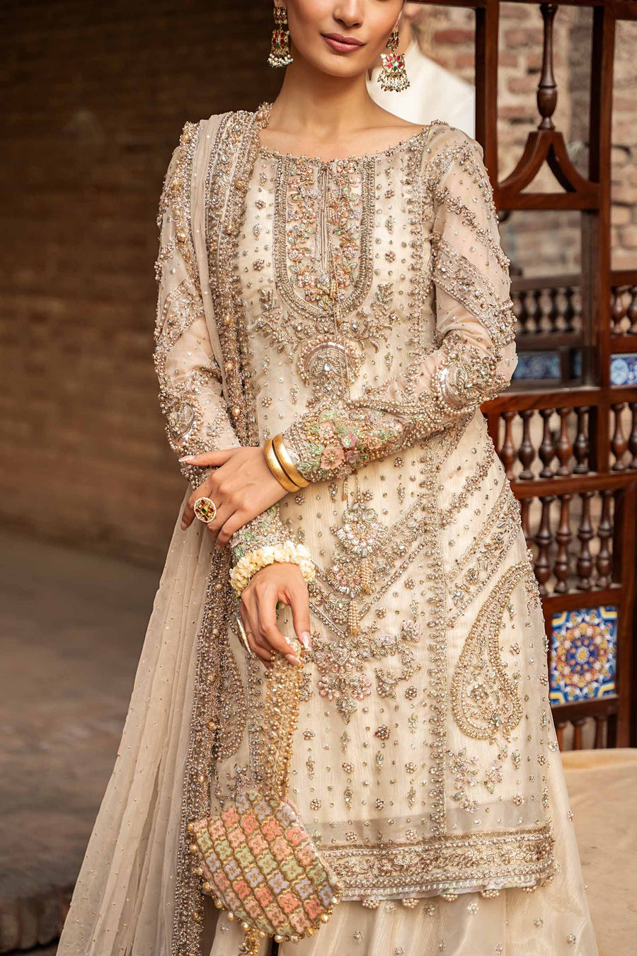 Embrace the timeless allure of 'Ishtar', a glorious creation in a heavenly ivory palette. This gharara set features an enchanting array of traditional & paisley patterns, rendered with exquisite applique work, creating a striking composition with glistening kundan, zari & cutdana bead embroidery. Surrounded by an elegantly mukesh work & lavishly adorned with cascades of delicate pearls, stones, tassels & glistening sequins, this piece is a hallmark of sophistication. Accompanied by a sumptuous mukesh dupatta that whipers of luxury while making it a perfect choice for a luxurious engagement, nikah, shendi & shalima occasion.