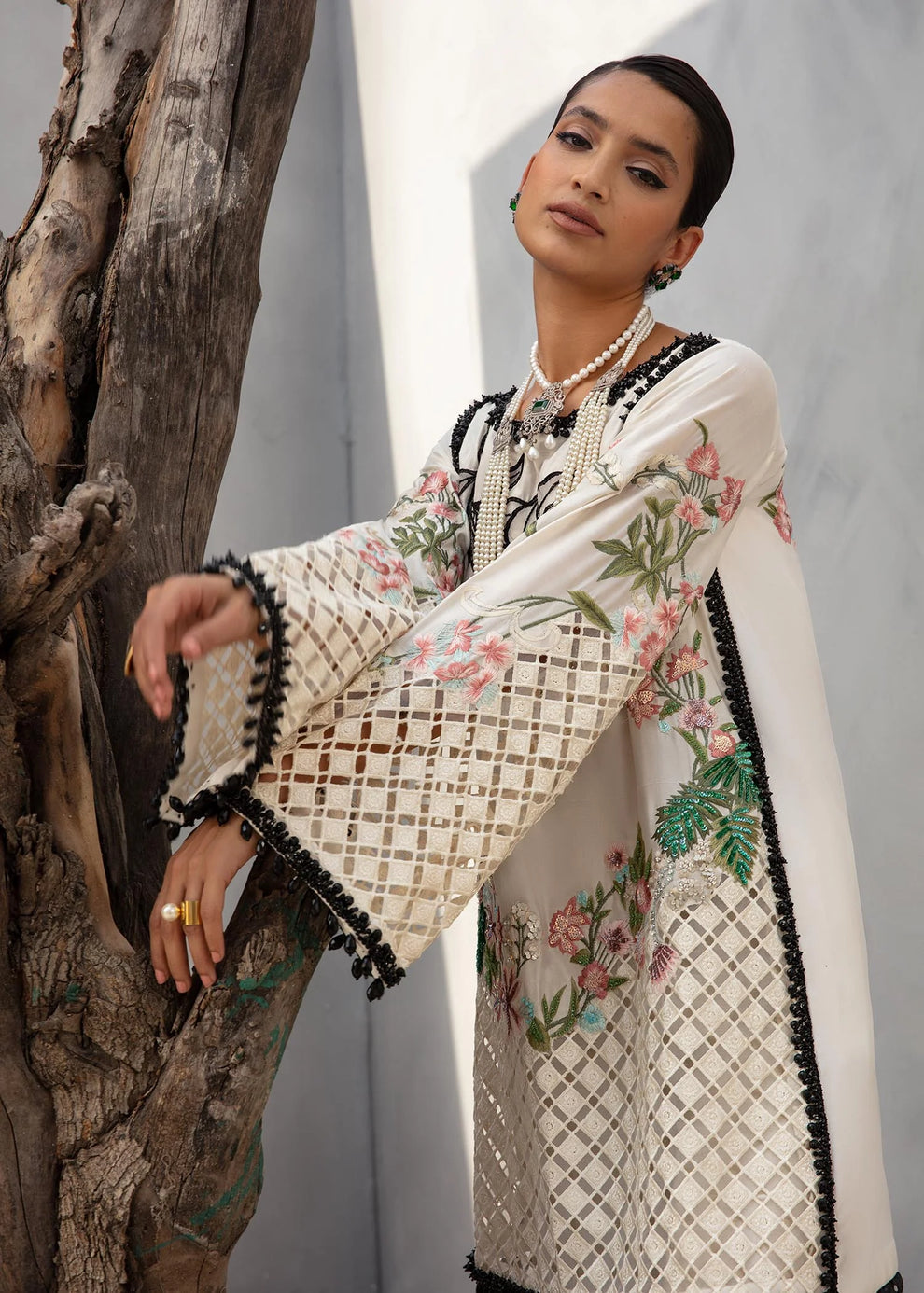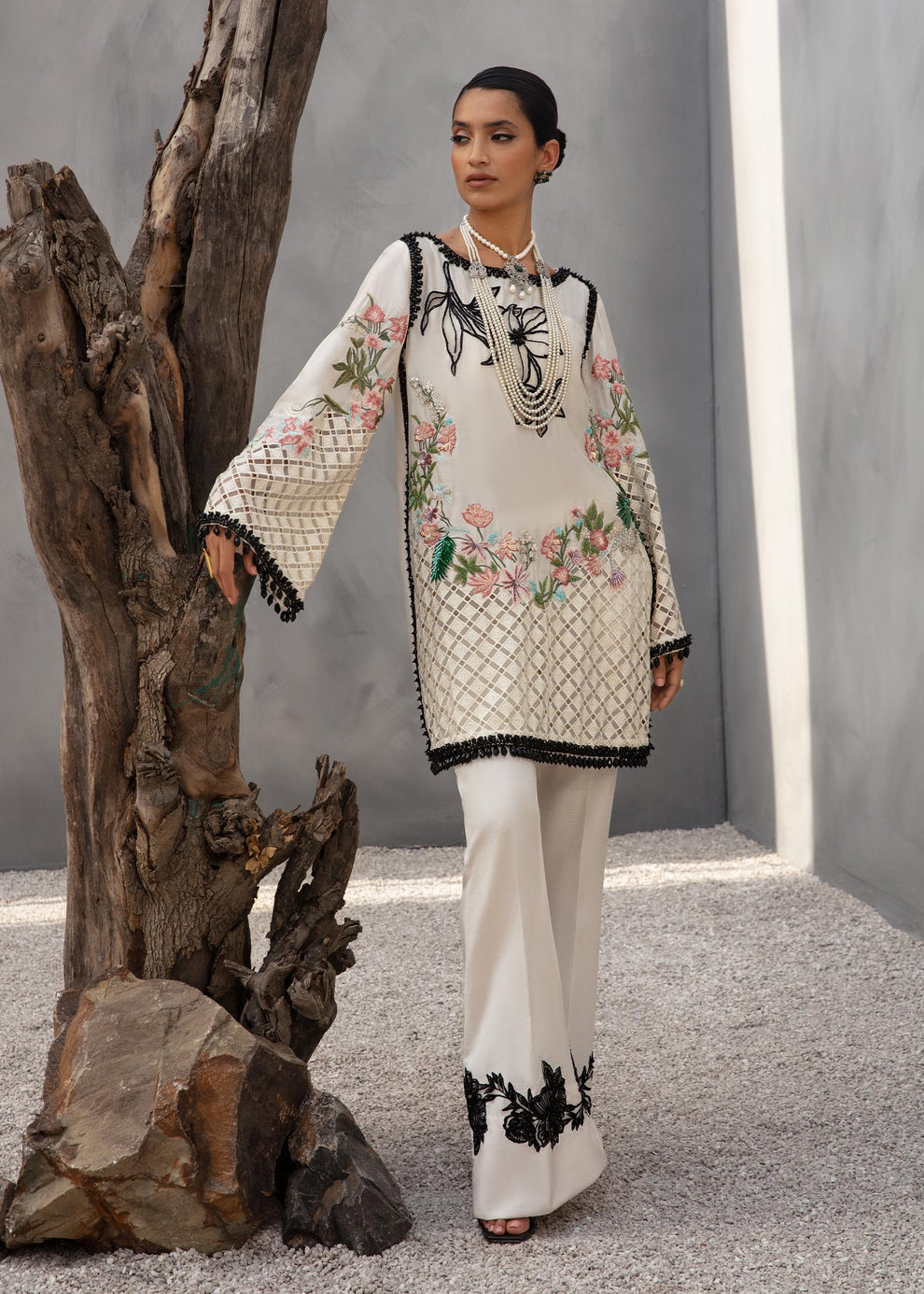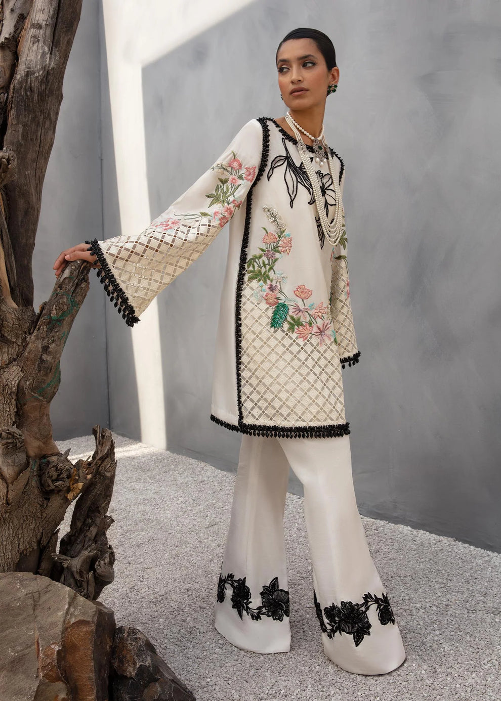 This monochromatic design has body embellished with a black motif on the shoulder and multicolored embroidered border in shades of pink and green with a cutwork hem on organza. The top is framed with black crystal border. Paired with dyed pants embroidered on the hem.