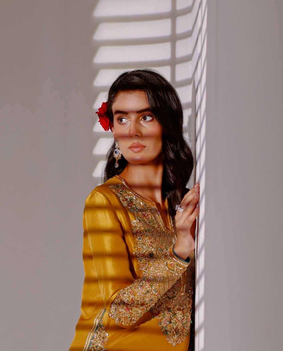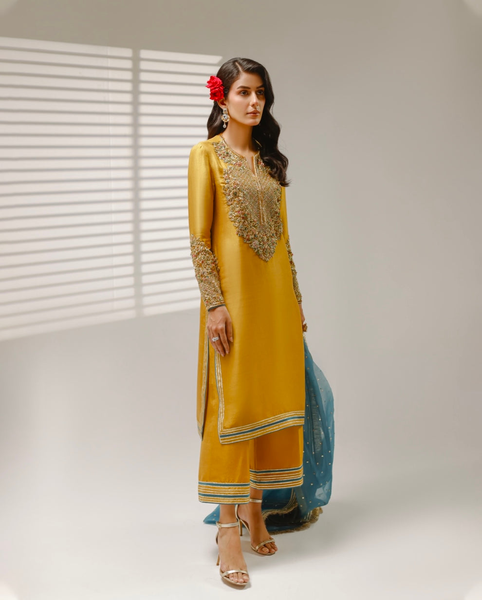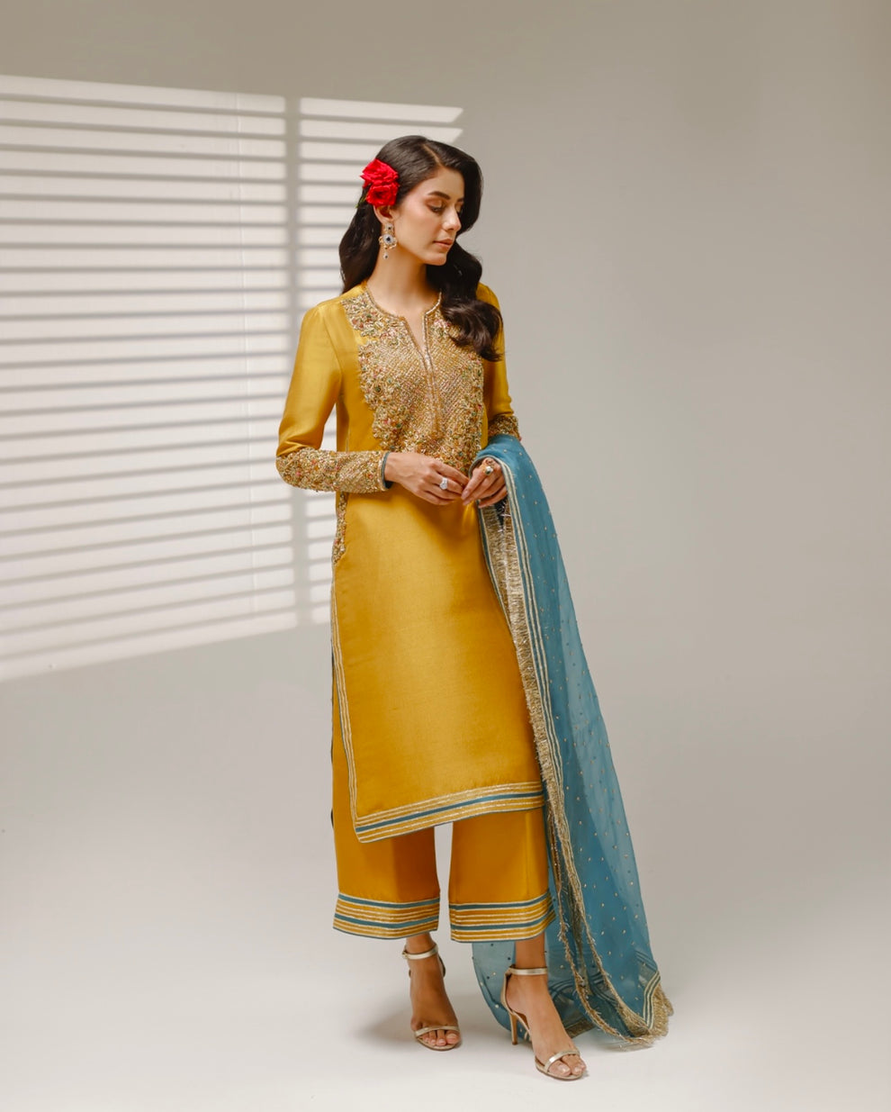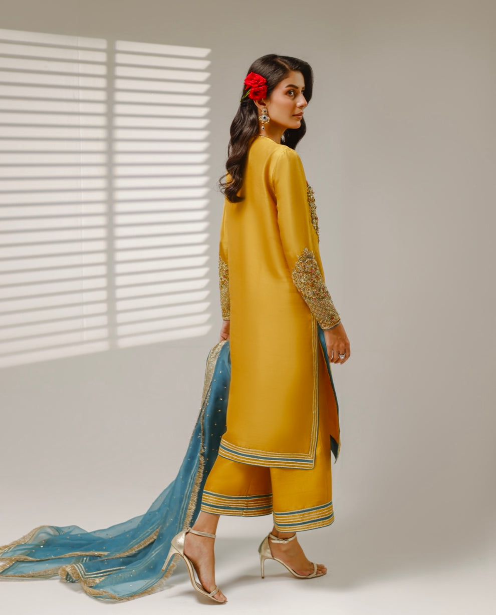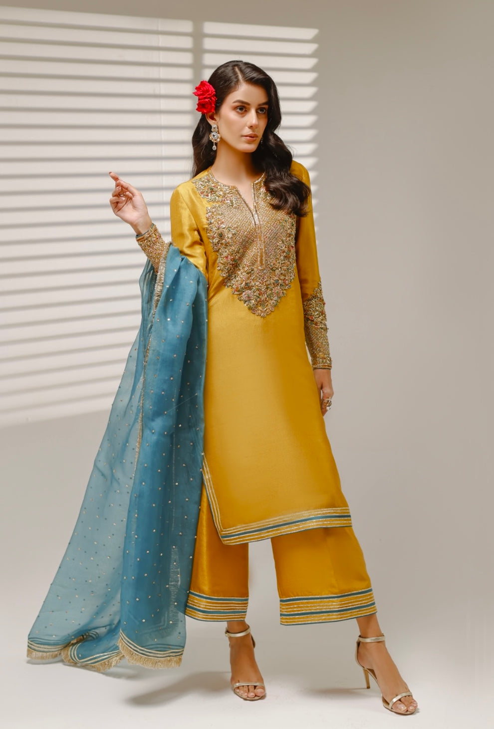 Color: Mustard Fabric: Shirt:Tissue Silk, Trouser: Tissue Silk, Dupatta: Pure Organza Work Detail:Handmade With Jewelry Material